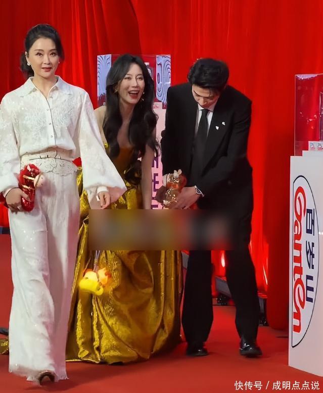 反观温峥嵘,真让人替她捏把汗。那条金色裹胸长裙单看挺华丽,可穿在她身上就变了味。人太瘦了,根本撑不起那个版型,裙子松松垮垮地挂在身上,走起路来裙摆还老被地毯勾住。辛云来全程弯腰帮她提裙子,两人走得那叫一个狼狈。温峥嵘脸上写满了不自在,步子碎碎的,注意力全在脚下,哪还有半点高冷范儿?这哪是走红毯,简直是受罪。衣服没选对,再好的资历也得跟着吃亏,看着都心疼。